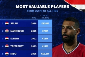 24直播网讯 根据德国转会市场数据,埃及球员历史最高身价排名出炉。萨拉赫以1.5亿欧居首,马尔穆什以7500万欧次之。埃尔内尼、特雷泽盖等球员也位列榜单,反映了埃及足球人才的市场价值变迁。