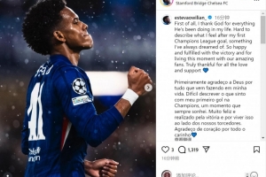 埃斯特旺社媒晒出庆祝进球的照片,配文:“首先我要感谢上帝在我生命中的一切恩典。难以描述攻入个人首个欧冠进球时的感受——这是我一直以来的梦想。”