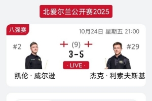 24直播网讯 2025年斯诺克北爱尔兰公开赛1/4决赛,杰克·利索夫斯基以5-3战胜凯伦·威尔逊,强势晋级四强。比赛中,利索夫斯基状态火热,打出一杆破百(104)和三杆50+,最终凭借更稳定的发挥锁定胜局。
